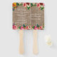 Vintage rustic themed wedding program fan, with graphics of a rustic burlap background and colourful vintage artwork of flowers, on the top and bottom. Personalise the text for your wedding day.