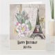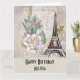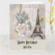 A personalised Happy Birthday greeting card with a pretty collage of painted flowers and vintage postmarks with a black illustration of the eiffel tower. Charming and chic design. Personalised text on the front written over top an image of burlap. Personalised message on the inside of the card.