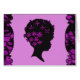 A retro vintage design featuring a magenta flowers in afro african american woman surrounded by a black and magenta scallop edged mosaic.