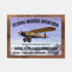 A weathered sign advertising the services of mythical Flying Moose Aviation of Talkeetna, Alaska. It features one of the company's blue-and-Yellow aircraft equipped with extra-large "tundra tires" for landing on rough terrain . Text reading, "FLYING MOOSE AVIATION", "We fly, tell us where you want to go", "HUNTING, FISHING, GLACIER LANDINGS, CARGO", and "Nome - Talkeetna - Fairbanks - Ft. Yukon" also appear.
