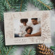 Chic and elegant holiday photo cards feature your favourite horizontal photo framed by rose gold foil holly and pine foliage in a line art style. Personalise with your custom greeting (shown with "comfort & joy") and your family signature.