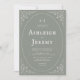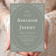 This elegant wedding invitation pairs a beautiful vintage typeface with sans serif font. The white text is framed by a thin oval surrounded by delicate botanical vine motifs in the corners, on a sage green background. The frame is repeated on the reverse, enclosing a pair of monogram initials.