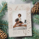 Chic and elegant holiday photo cards feature your favourite vertical photo framed by rose gold foil holly and pine foliage in a line art style. Personalise with your custom greeting (shown with "always merry") and your family signature