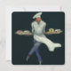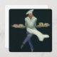 Vintage illustration food and bakery industry design featuring a professional French baker wearing a fancy hat and an apron. A pastry chef carrying homemade pastries, cakes, cookies, cupcakes, sweets and other desserts on trays fresh from the oven in the bakery. He's so happy he looks like he's dancing!