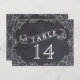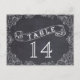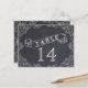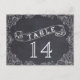 Vintage scroll leaf frame and chalkboard wedding table number postcard featuring a white vintage frame of scroll leaves on a charcoal grey chalkboard or blackboard background and your text in a scroll banner. A modern and contemporary approach to a vintage theme. This retro template design is part of a wedding set, is fully customisable and can be personalised.