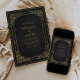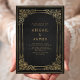 This elegant wedding invitation features an ornate vintage gold frame on a distressed off-black background in imitation of an antique book cover. Customise the gold-coloured text with your names and wedding details. The frame design is repeated on the back of the card.