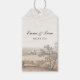 Elegant personalized wedding favor tag featuring a soft French countryside toile illustration in warm ivory tones.