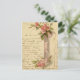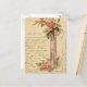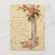 Vintage illustration of a glass vase wrapped in a silk pink ribbon and filled with pink tea roses. Handwriting in the background and along the edges.