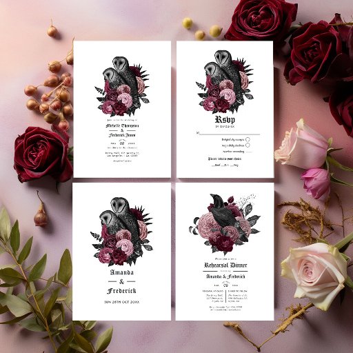 Floral raven gothic wedding bridal shower invitation in accents of burgundy customisable to your event specifics.
