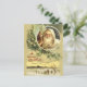 Victorian era Christmas card with Santa Claus in off-white robe with gifts, evergreen branch, winter sunset scene in the country, typographic Christmas greetings in old script, "A Merry Christmas" and editable message, name and address on the back, for the nostalgic holidays.