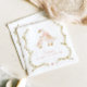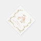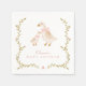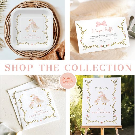 This baby shower napkin design features a cute little goose and her mama, and a whimsical watercolor greenery frame design with pink floral elements.