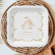This baby shower paper plate design features a cute little goose and her mama, and a whimsical watercolor greenery frame design with pink floral elements.
