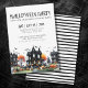 Welcome guests to your Halloween costume party with this spooky and vintage-themed invitation. The design features a black and white colour scheme with a mix of ornate and serif typography. At the bottom, several dark, eerie haunted houses create a spooky neighbourhood scene, accented with pops of orange from pumpkins, jack-o-lanterns, and haunted trees. Cute ghosts and bats add a whimsical touch, while the distressed font brings a vintage, grunge-inspired vibe. On the back, black and white stripes complete the look, but you can still change the background or stripe colours to suit your party style. Spooky Vintage Haunted Neighbourhood Halloween Party Invitation Ghosts Bats Stripes.