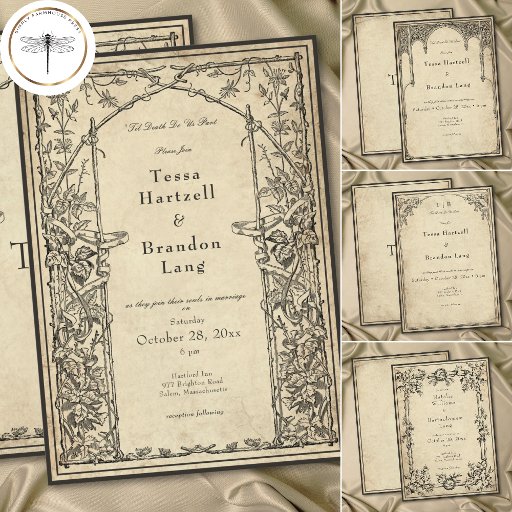 Elevate your gothic wedding with a medieval-inspired wedding invitation that exudes timeless elegance and mystery. Designed to replicate an antique vintage feel, this stunning design features delicate black line art gothic borders on a vintage, aged parchment brown background, evoking the charm of a bygone era. The wording, "Til Death Do Us Part" can be edited and changed, or deleted entirely, if you prefer. Let your love story unfold with an invitation as unforgettable as your day. Created by Simply Farmhouse Press.