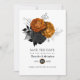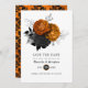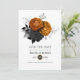 Vintage orange and black floral gothic Halloween-themed wedding save the date invite customisable to your specifics. Should your names look a bit off-centred when entered, "Click to customise further" (the blue link at the bottom of "Personalise this template") to easily adjust in the design area.