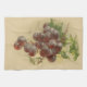 An illustration of a bunch of purple red grapes hanging on the vine with leaves, on a dark cream or beige background, from a vintage painting by artist Catharina or Catherine Klein, born 1861.