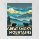 A vintage-style poster for Great Smoky Mountains National Park depicts two black bears in the foreground facing each other, set against a backdrop of layered blue and green mountain ranges, evergreen trees, and a cloud-filled sky. "GREAT SMOKY MOUNTAINS NATIONAL PARK" is displayed prominently at the bottom.