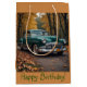 This gift bag features an antique green car in autumn. Text can be changed or eliminated.