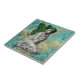 Beautiful collage art features black and white woman draped in simple cloth with added green butterfly wings on a background of aqua and gold distressed ephemera