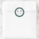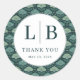 This elegant wedding sticker features a vintage-inspired design with a circular centerpiece surrounded by stylized leaf motifs in various shades of green, creating a harmonious and lush background. The central circle highlights the initials "L" and "B," separated by a vertical line, above the phrase "THANK YOU" in classic serif typography, conveying gratitude and formality. The intricate botanical pattern adds continuity and sophistication, making it perfect for expressing appreciation at your special event. Ideal for weddings or formal celebrations, this sticker combines decorative detail with a timeless aesthetic to enhance your occasion.
