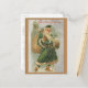 Nostalgic and charming antique holiday illustration featuring green-robed Father Christmas carrying a bag of presents as he walks through the snow with boots and cane with church steeple in background and "Christmas Greetings" in red typography. Back features complementary ornate engraved ornamental gold frame with suggested greeting and editable text fields. Border colour is editable.