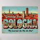 Celebrate the historic and learned city of Bologna with this retro postcard-style illustration. “BOLOGNA” appears in uppercase letters filled with miniature images of the Two Towers, Piazza Maggiore, Neptune Fountain, and the city’s famous porticoes. Behind the text, red rooftops and mediaeval towers create a vibrant vintage scene. Perfect for lovers of Italy’s mediaeval charm.