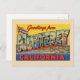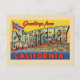 This is a classic vintage-style postcard design featuring the phrase "Greetings from Monterey, California." The large, stylised letters of MONTEREY each contain a unique scene from the city, including its picturesque harbour, waterfront buildings, palm trees, and the California state flag. The design has a nostalgic, mid-century feel with its retro colour palette and bold font, making it perfect for products like postcards, posters, and t-shirts for anyone who loves vintage travel art or the beautiful coastal city of Monterey.