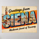 Capture the mediaeval charm of Siena with this retro postcard-style illustration. “SIENA” appears in uppercase letters filled with miniature images of Piazza del Campo, Torre del Mangia, Siena Cathedral, and Palio horse race scenes. Behind the text, the bustling piazza and historic buildings are rendered in vivid vintage colours. Ideal as a wall poster gift for Tuscany lovers.
