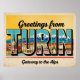 Highlight the elegance of Turin with this retro postcard-style illustration. “TURIN” appears in bold uppercase letters filled with miniature images of the Mole Antonelliana, Royal Palace, Piazza Castello, and the snow-capped Alps. The colourful background captures Turin’s classic architecture and alpine views. Ideal as a wall poster for fans of northern Italy.