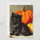 Card featuring a vintage Halloween black cat and pumpkins! This little ball of fur sits adorably next to two orange pumpkins. A great gift for Halloween parties and cat lovers!