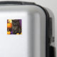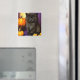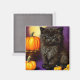 Magnet featuring a vintage Halloween kitten! A fluffy black kitty poses next to pumpkins against a purple background. A fun gift for Halloween parties and cat lovers!