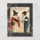 Vintage Halloween card. At top "For Hallowe'en". At left an old woman in long grey dress with white apron and large collar . She's wearing a bright orange cape and a black pointed witch's hat. She' holding a black cat and a small cauldron. At right is a stylish young woman in a long blue coat with wide white fur trim at neck and cuffs. She's holding a white fur muff. She's wearing a blue hat with two orange feathers.. Behind is a background of stars on back