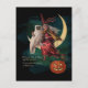 Vintage Halloween postcard design. The design has a vintage Halloween witch and owl sitting on a moon. The witch is holding a Halloween Jack O Lantern. The Halloween verse says "When the owl and witch together are seen, there's mischief brewing on Halloween".