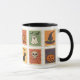 Add a fun, retro vibe to your autumn with this 11 oz white coffee mug featuring a black handle and interior, decorated with 12 vintage-style Halloween stamps. Each stamp showcases a classic seasonal character: a smiling pumpkin, a black cat, a playful ghost, a bat, a spider web, a cute skull, a hat witch and more.