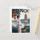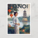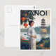 Capture the timeless elegance of Vietnam's capital with this captivating vintage-style travel poster postcard for Hanoi. The artwork features a graceful woman in a traditional white Ao Dai, standing beside the tranquil Hoan Kiem Lake. In the background stands the iconic Thap Rua (Turtle Tower), surrounded by lush foliage, pink lotus flowers, and bright red lanterns. The clean lines and soothing blue and white palette evoke a sense of peaceful, classic Vietnamese beauty. This postcard is a wonderful souvenir for Vietnam travel enthusiasts, collectors of retro Asian art, or anyone who appreciates the culture and scenery of Hanoi.