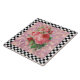 Pretty vintage pink roses botanical illustration on pink floral background with black and white chequerboard pattern border creates a lovely garden theme design.