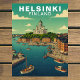 Capture the serene maritime beauty of the North with this elegant Helsinki, Finland Travel Card. This vintage-style illustration features a bustling harbor filled with traditional fishing boats and market stalls along the pier.