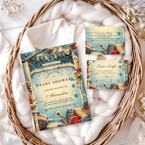 A nostalgic winter design featuring classic hockey sticks, skates, and snow-dusted details set against a soft vintage rink backdrop. The warm retro tones and hand-painted textures create a cozy, old-world feel — perfect for celebrating a little one’s arrival with a sporty, timeless twist.