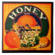 Vintage ,orange blossom, honey company advertisement. Features oranges, orange blossoms and says "Honey". In bold and warm colours of orange, green, white and black.