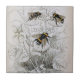 Faded ivory backdrop penciled drawing with black and yellow striped honey bees feeding on pollen