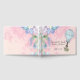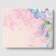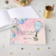 Sweet vintage-looking hot air balloon with a couple and an old-fashioned telescope illustration with a floral pink and blue-flowered background.