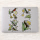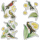 Set of four stickers with vintage illustrations of hummingbirds. Colourful green and red hummingbirds perched on tropical plants with yellow flowers.