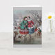 Vintage artwork features a grey and cold wintery day where two young women and some children and even dogs are having fun on a frozen pond. The two fashionably dressed young women ice skate side by side, their heads close together as they chat and gossip. They pass by a sign that says "Dangerous" without even noticing it. In the background people ride by in a horse-drawn sleigh. This card is blank inside for your own message.