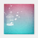 A whinsical vintage style illustration with a drawing of a white bird cage and a little bird sitting inside with the door open. Many birds are flying around outside. The background is a gradient of blue green blending into purple and red.