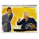 12 month vintage illustration business calendar featuring various occupations including firemen, mailman, construction workers, architects, businessmen, secretary, and a switchboard operator.
