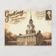 Transport yourself to the past with our vintage-style postcard featuring Independence Hall in Philadelphia, Pennsylvania. This sepia-toned illustration captures the timeless beauty of this historic landmark, showcasing its intricate architecture and significance in American history. The distressed edges and worn texture evoke nostalgia, while the 'Greetings from Independence Hall' message in classic cursive font adds to its antique charm. A perfect keepsake or gift for history enthusiasts and travelers alike.