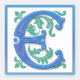 Inspired vintage initial E in blue, green and white. Vintage monogram created by print2d and licensed from Clipartto.com. Derivative design work by VintageCabaret.