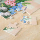 A soft, little, Spring Lamb pokes its head out the window of a colourful easter egg abode adorned with an assortment of Spring flowers.