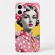 A vintage-inspired portrait of a stylish woman in a pink polka-dot headscarf and shirt, set against a bold yellow background with a pop-art feel and glossy, high-contrast aesthetics.