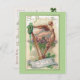 Nostalgic vintage St. Patrick's Day illustration featuring gold Celtic harp, scroll, shamrocks and greeting. Back of card features complementary graphics with editable text fields.